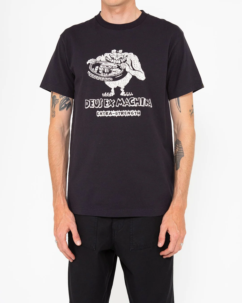 "The Rat Finx Tee¬†is a part of the Deus Ex Machina Fall¬ Mens Collection. This¬†regular fit t-shirt¬†features: ‚ó謆Chest and back prints of original Deus artwork ‚ó謆100% recycled cotton 200gm jersey fabrication ‚ó謆A¬†heavy enzyme stone wash Designed and tested at the Deus House of Simple Pleasures, Camperdown, Sydney. Size (cms) XS S M L XL XXL XXXL Chest Width 46.5 49 51.5 54.5 58.5 63 67.5 Body Length 70 71.5 73 74.5 77 79.5 82 X Shoulder Width 44.1 45.3 46.5 47.7 48.9 50.4 51.9 Sleeve Length 19 19.5 20 20.5 21 21.5 22 "