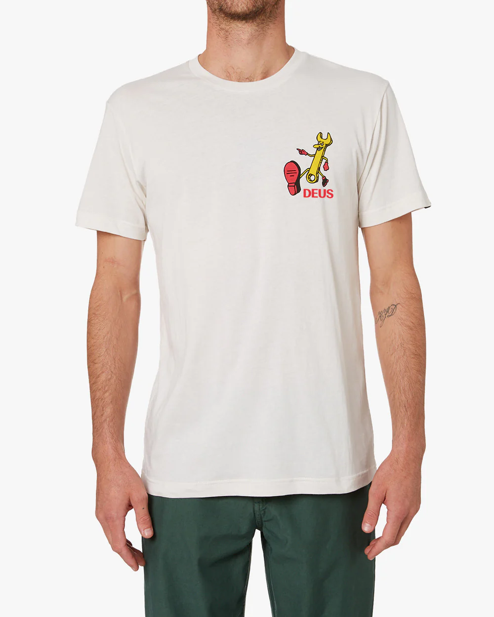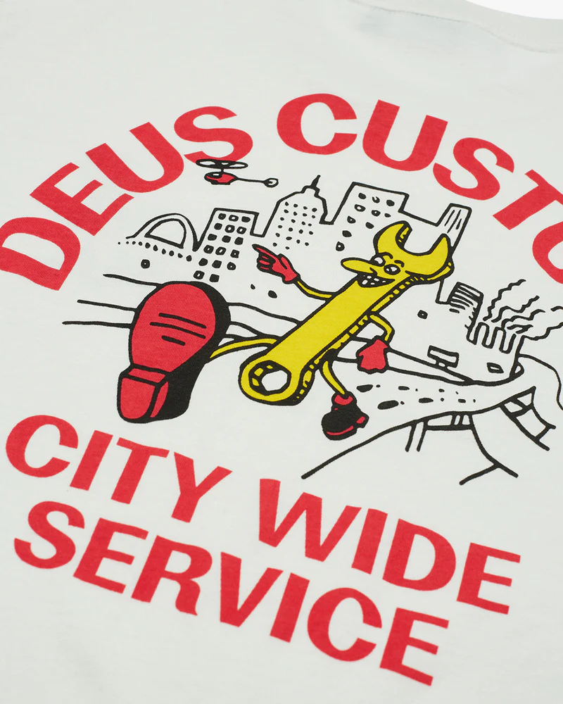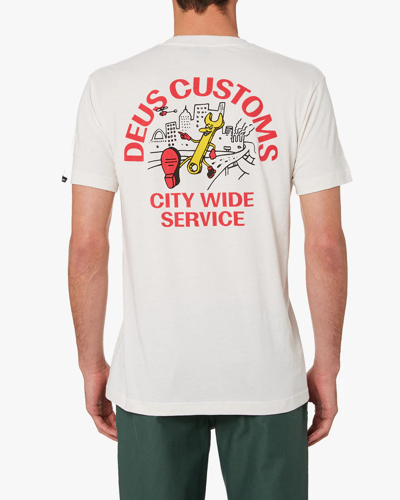 "The City Wide Tee is a part of the Deus Ex Machina Men's Collection. It’s T-Shirt Time. Each season brings along a fresh collection of graphic tees, sponsoring finely fettled embellishments in a range of sizes and cuts. The latest crop to hit the streets features classic Deus styling you've come to love - making them as perfect as ever - for larrikins and their gambols.  This regular fit t-shirt features: ● Front print of original Deus artwork ● 150gm combed cotton jersey fabrication ● Garment wash Designed and tested at the Deus House of Simple Pleasures, Camperdown, Sydney."