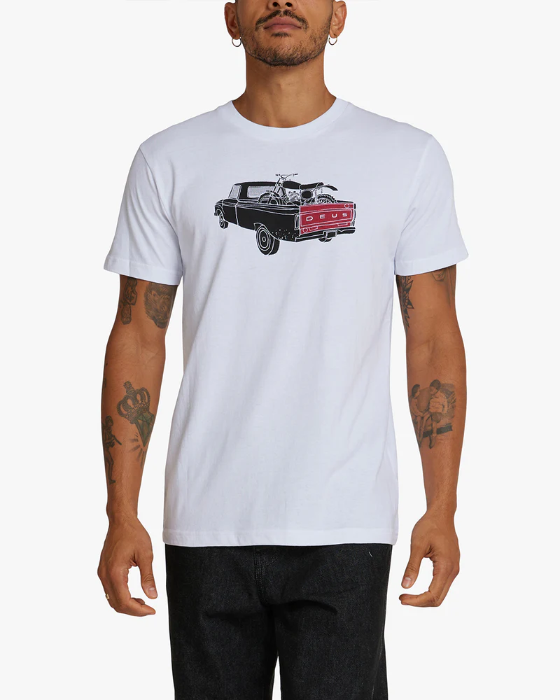 "The Carby Pickup Tee is a part of the Deus Ex Machina Classics Collection. This regular fit classic t-shirt features: ? Chest art of original Carby artwork ? 190gm oe 100% cotton jersey fabrication ? A garment wash Designed and tested at the Deus House of Simple Pleasures, Camperdown, Sydney. Size (cms) XS S M L XL XXL XXXL Chest Width 46.5 49 51.5 54.5 58.5 63 67.5 Body Length 70 71.5 73 74.5 77 79.5 82 X Shoulder Width 44.1 45.3 46.5 47.7 48.9 50.4 51.9 Sleeve Length 19 19.5 20 20.5 21 21.5 22 Wash Care: ? Gentle machine wash with similar colours ? Wash inside out ? Iron print on reverse"