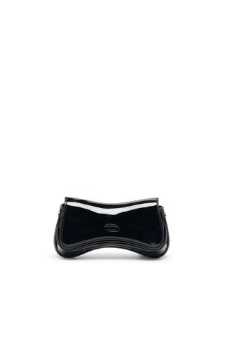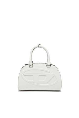Bandolera para mujer de cuero napa suave. Con forma de bolso de mano ovalado similar a una caja, este bolso está visiblemente adornado con una placa metálica esmaltada D y tiene un tirador largo de cremallera que puede usarse en la muñeca.