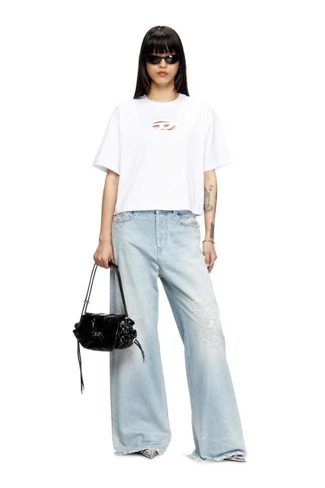 Camiseta extragrande para mujer hecha de algodón orgánico. Este modelo tiene una forma ligeramente cuadrada y un logotipo fresco con efecto cucú: un parche Oval D bordado y cortado con láser deja entrever la piel en el pecho.
