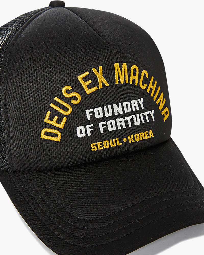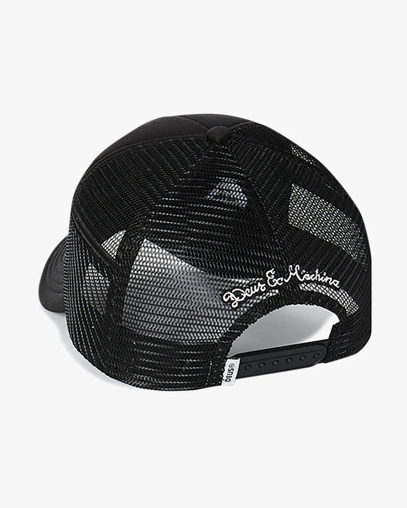 "The Fortuity Trucker is a part of the Deus Ex Machina Spring Accessories Collection. Our newest selection of branded headwear has arrived. Caps, truckers, brims and buckets, especially designed to keep your beak from burning. This classic trucker cap features: -Front and back embroidered art -Poly interlock -Polyester mesh fabric -Plastic snap adjuster Designed and tested at the Deus House of Simple Pleasures, Camperdown, Sydney."