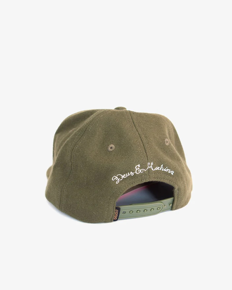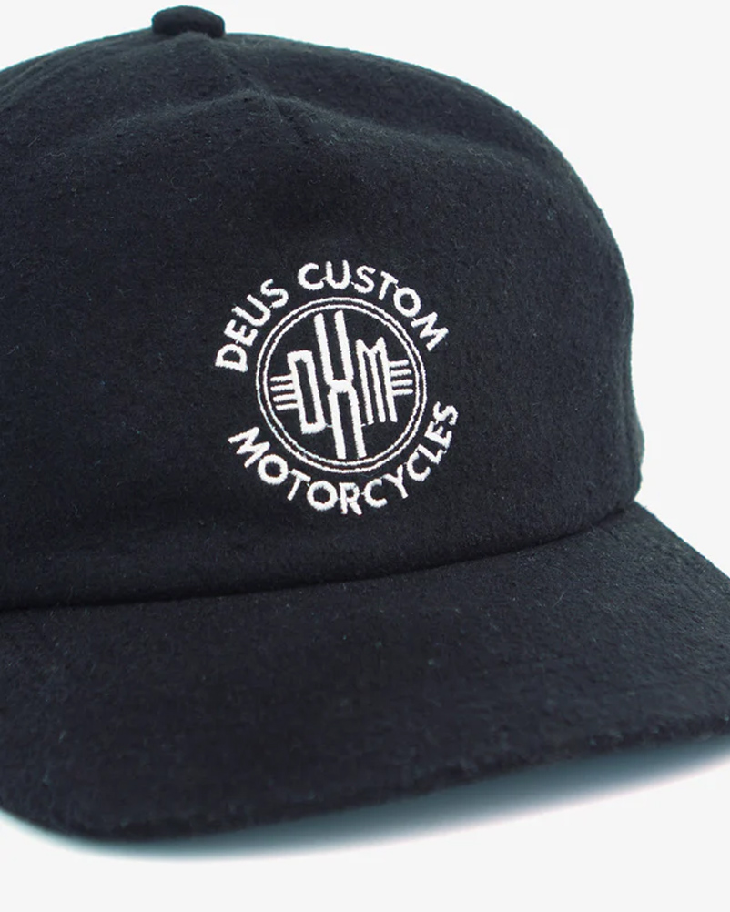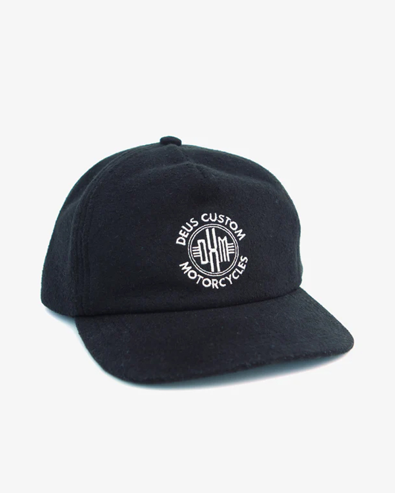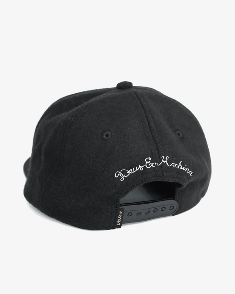 "The Coop Felt Cap is a part of the Deus Ex Machina Accessories Collection. This classic 5 panel dad cap features: -front and back embroidered Deus art -100% acrylic felt fabric -plastic snap adjuster Designed and tested at the Deus House of Simple Pleasures, Camperdown, Sydney."