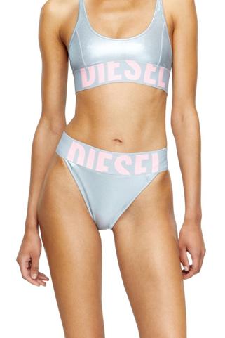 Top de bikini elástico para mujer con escote delantero bajo y espalda deportiva. El tejido de brillo metálico contiene fibras recicladas, y un gran logotipo recortado en la cintura ancha.