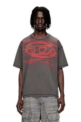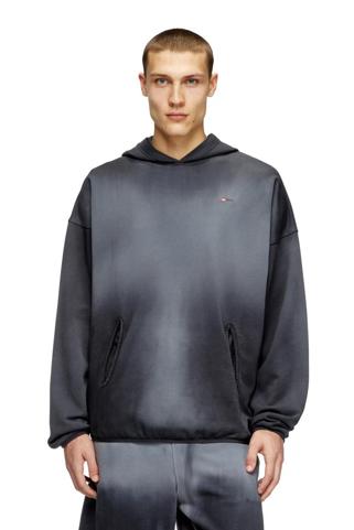 Pantalones deportivos para hombre con un tratamiento de lavado burn-out tipo mármol creado para el desfile de esta temporada. El corte es relajado, con cintura y puños elásticos, bolsillos con aberturas en las caderas y un único bolsillo de parche en la parte trasera. Debajo del bolsillo lateral izquierdo se ha aplicado una transferencia de la etiqueta Diesel en jacquard.